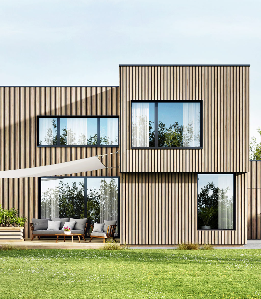 Es entsteht auf umwelt- und materialschonende Art und Weise eine grundsätzlich wartungsfreie Massivholzfassade.